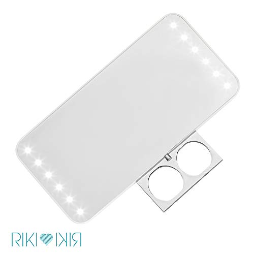 ntroducing the latest member of the RIKI LOVES RIKI family: RIKI CUTIE. She is 100% portable, powerful, and pretty, with 3 brightness levels, built-in leg stand, and a retractable finger ring for security, you will never be caught anywhere in anything less than your PERFECT light. RIKI CUTIE is not just a wearable, shatterproof pocket mirror; she is a practical, useful accessory you can wear on your hand and still have at least three fingers free to manipulate your makeup components while you apply your look with your other hand! Included with purchase is the RIKI CUTIE mirror, soft carrying sleeve, and micro USB cable. She is rechargeable, ultra lightweight, and features shatter-proof glass – making it the ultimate accessory for travel and everyday use.