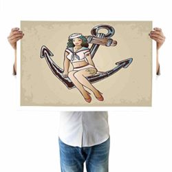 Anchor Drawing Pinup Girl with Sailor Outfit Shark and Heart Tattoo Vintage Twenties Illustration Accessories 16″x20″inch Multicolor